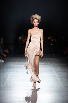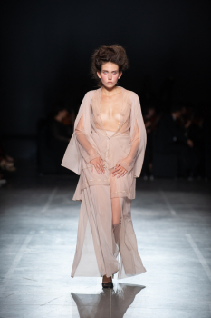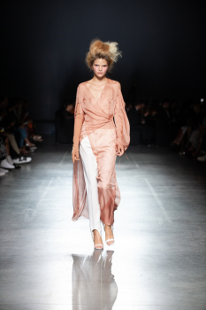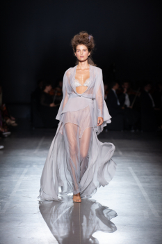 Завершила модное шоу топ-модель Наталия Гоций. Она прошлась по подиуму в полупрозрачном лавандовом платье.
