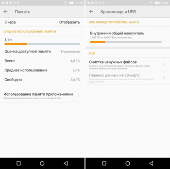 В итоге, новый интерфейс очень порадовал качеством исполнения, и, в отличие все от той же MIUI, он не расходует оперативную память попусту: после первого запуска доступно 2,6 гигабайта из 4. Что же до встроенной памяти, то из 64 Гб, с учетом установленной системы, свободно 50 Гб.