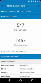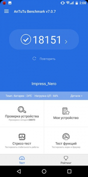 Вот результаты в паре бенчмарков. Да, воображение они не поражают. Но стоит помнить два момента. Первый: Vertex Impress Nero стоит 6 900 рублей, и для смартфона за такие деньги результаты ожидаемые. Второй: все эти цифры имеют скорее, гм, научную ценность, чем практическую. Потому что в реальности по нашим тестам Vertex Impress Nero работает шустро и позволяет играть даже в 3D-игры. Без лагов и подвисаний.