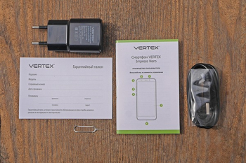 В комплект поставки входят инструкция, гарантийный талон, скрепка для извлечения лотка SIM-карт и зарядное устройство. Последнее, как водится, составное: кабель MicroUSB и блок для розетки. Блок на 2 А, то есть не самый слабый – порой производители бюджетных смартфонов до сих пор и на 1,5 А кладут. А самые жадные – на 1 А. В реальности Vertex Impress Nero полностью заряжается менее двух часов, а если бы был на 1 А – то полная зарядка заняла бы примерно вдвое больше времени.
