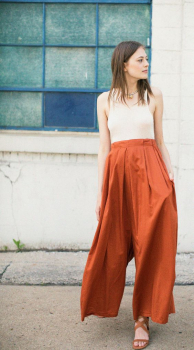 - Широкие брюки. Свободные, расклешенные брюки смотрятся с терракотовым очень контрастно. Под такие брюки лучше всего носить свободные блузы, однотонные футболки или майки.