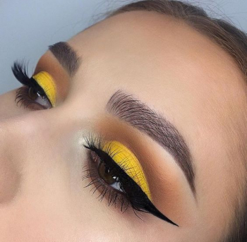 - Макияж с желтым цветом. В год Желтой Земляной Свиньи визажисты рекомендуют создать макияж на Новый год с желтым цветом. Желтый цвет — это не всегда кислотные оттенки. В моде будут такие оттенки в макияже: золотистый, лимонный, банановый, абрикосовый, шафрановый и другие. Лучше всего желтый цвет гармонирует с такими контрастными оттенками, как синий, зеленый, малиновый, бирюзовый.
