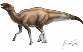 Пасть рептилии напоминает утиный клюв, а верхняя челюсть представляет собой изогнутый носовой гребень.