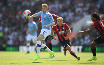 Полузащитник Манчестер Сити Кевин Де Брюйне в матче 3-го тура АПЛ против Борнмута отметился 50-й результативной