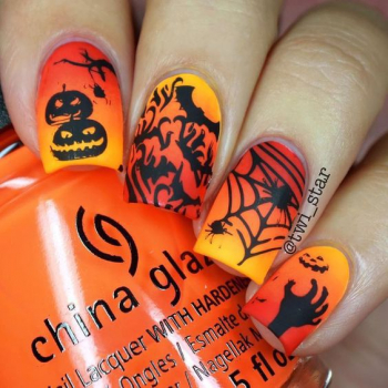 Кроме этого, особенно креативные девушки любят украшать тыквой ногти. Такой оригинальный маникюр несомненно привлечет к тебе внимание и окунет в таинственную и загадочную атмосферу праздника. Традиционными цветами для маникюра с тыквой считается оранжевый, желтый, темно-зеленый, коричневый и черный.