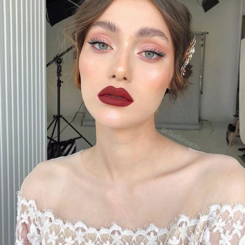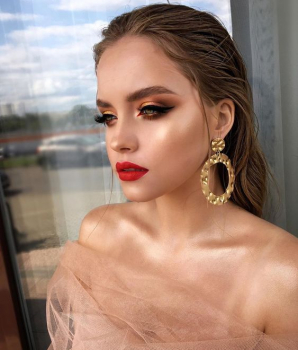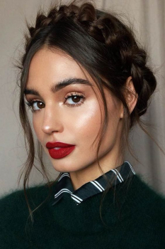 • Красная помада – классический вариант праздничного макияжа.  Она всегда актуальна и выбрав такой макияж ты точно не прогадаешь. А если еще прибавить к помаде красиво подведенные глаза в золотисто-коричневых оттенках, внимание поклонников мужского пола тебе обеспечено.