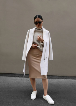 • Юбка. Этой весной обрати внимание на юбки миди длинны, так как слишком короткие или длинные юбки будут выглядеть неуместно в бежевом цвете. В новом сезоне надевай бежевую юбку в офис, на деловую встречу, комбинируя ее с casual стилем