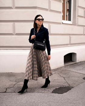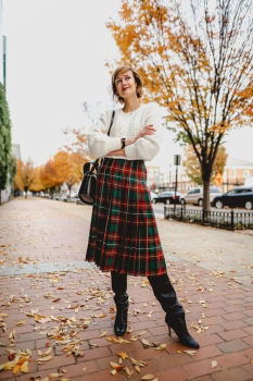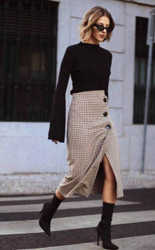Куда же без главного осеннего принта – клетки. Юбка А-силуэта с классическим клетчатым принтом невероятно универсальна. Ты можешь комбинировать ее с водолазками и свитерами для повседневного лука, и с женственными блузами для вечернего образа и торжественного мероприятия.