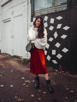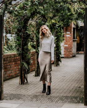 Нам всем хорошо знаком бельевой стиль, ведь он был широко популярен этим летом. И если ты уже достаточно наигралась с платьями-комбинациями, обрати внимание на юбки в бельевом стиле. Шелковая юбка длины миди будет стильно смотреться на контрасте с плотными свитерами и маскулинными ботильонами. Накинь сверху модное осеннее пальто, и образ готов.