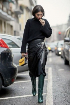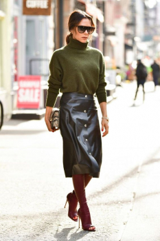 В этом сезоне кожа стала must-have стильных девушек со всего мира. Пальто, брюки, жакеты, платья – дизайнеры неустанно намекают нам, что кожа в моде. Это касается и юбок, причем советуем отдавать предпочтение длинным юбкам прямого кроя или юбкам-плиссе. Такой вариант кожаной юбки поможет избежать вульгарности в образе.