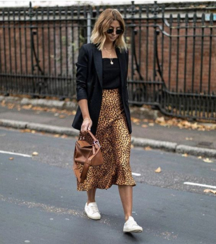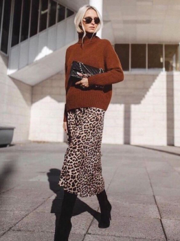 Уже который сезон анималистичный принт не сходит с прилавков модных бутиков, а именитые дизайнеры неустанно создают его новые вариации. Рекомендуем обратить внимание на леопардовую юбку длины миди. Сочетай ее с монохромными водолазками черного, коричневого или белого оттенков, топами и футболками приглушенных цветов, жакетами и даже свитерами. Дополни образ ботильонами или грубыми ботинками.
