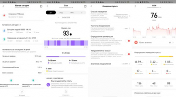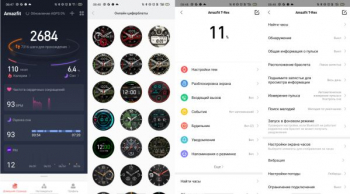 Основной экран представлен набором виджетов: шаги, калории, сон, частота сердечных сокращений, список записанных тренировок и рейтинг системы Huami-PAI. При нажатии на каждый выводится подробная информация с таблицами параметров, фазами сна, графиками, картами, рекомендациями и так далее. Кроме этого, приложение позволяет сохранять и вести учет десятков различных данных: от обхвата груди до содержания жира в организме.