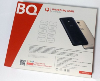 Смартфон BQ Jumbo с индексом BQ-6001L поставляется в картонной многоцветной коробке, в оформлении которой преобладает ярко-красный: фирменный цвет BQ. Упаковка вполне неплохая, материал плотный, и выглядит все очень дорого.
