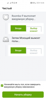 Очень полезная функция – уборка по расписанию: просто назначаем время и комнаты, в которых робот будет мыть полы. Например, у меня уборка происходит в то время, пока я на работе, поэтому прихожу домой всегда в чистую квартиру. Для начала процесса можно и просто нажать большую кнопку «Clean» на основном экране, причем если подключена модель для сухой уборки, то будет предложено вначале выполнить е    е, а по завершению, автоматически начнет трудиться Braava.