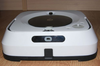 Передвигается робот на двух колесах с небольшим ходом подвески, чего, впрочем, хватает для преодоления порогов, а на ковры ему влезать и не положено. Пара контактов расположена сзади, а по периметру находятся датчики, контролирующие перепады высоты, чтобы Braava не свалился с лестницы. Вместо всасывающего отверстия, снизу находится крепление для установки салфеток, а специальный датчик позволяет роботу определить, какая именно установлена насадка, и выбрать соответствующую программу.