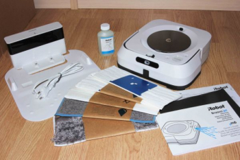 Поставляется Braava jet m6 в небольшой картонной коробке, содержащей сам робот, зарядную станцию с поддоном, шнур питания, моющее средство, документацию и комплект салфеток для сухой и влажной уборки (2 многоразовые из микрофибры и 4 одноразовые).