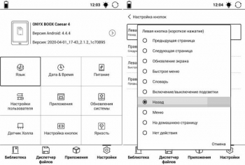 В настройках можно менять практически все параметры ридера, в том числе и выбирать действия по короткому или длинному нажатию на ту или иную кнопку. Это позволяет очень тонко настроить взаимодействие с книгой, однако стандартный вариант нам понравился больше всего.