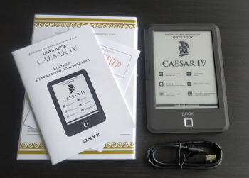 Комплектация Caesar IV, с учетом невысокой стоимости книги, весьма аскетичная – из дополнительных аксессуаров в коробке есть лишь кабель зарядки и синхронизации с ПК, а чехол и зарядное устройство придется покупать отдельно. Впрочем, подойдет и зарядка от смартфона или планшета, а в фирменном магазине Onyx Boox есть широкий выбор чехлов. Также в комплект поставки входят гарантийный талон и весьма подробная инструкция по использованию.