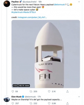 Неожиданно Маск прокомментировал публикацию, отметив, что предлагает отправить машину с помощью лайнера Starship.