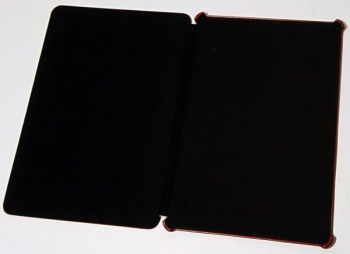 Аксессуар выполнен из плотных качественных материалов: снаружи это кожа темно-красного цвета с тиснением на верхней крышке, прошитая по всему периметру однотонной капроновой нитью. Внутри отделка выполнена из мягкого материала черного цвета, бархатистого на ощупь. Он был выбран неспроста: его мягкая структура не навредит ни корпусу, ни тем более дисплею, но у него есть один недостаток: он очень сильно притягивает пыль. Чистить его лучше всего специальным роликом с липкой лентой.