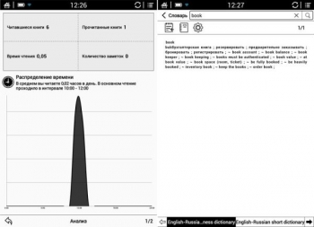 К дополнительным функциям, нужным для чтения, здесь относятся словарь и приложение статистики. Последнее – это нововведение Onyx, мотивирующее одних и расстраивающее других, поскольку оно показывает количество прочитанных в день или другой период времени страниц и может даже построить график зависимости прочитанных страниц от времени. Пользоваться приложением очень легко. Словарь подскажет значение нового слова и его перевод с английского – можно вписывать слова вручную или копировать прямо из текста книги или документа.