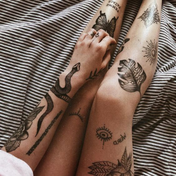 Это может быть большой рисунок на бедре, надпись под коленкой, аккуратный листочек на лодыжке или портрет Фриды Кало на икре. В общем, ноги — огромный чистый холст, на котором можно изобразить события всей своей жизни.