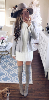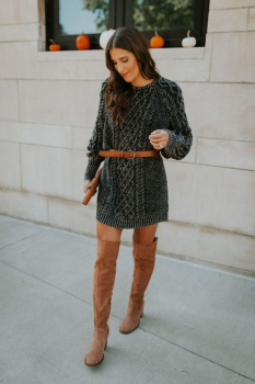 В зависимости от длины и фасона, свитерные платья носят с ботфортами, ботильонами или высокими сапогами. Прекрасно сочетаются с платьем-свитером объемные шарфы, шапки, картузы или шляпы.