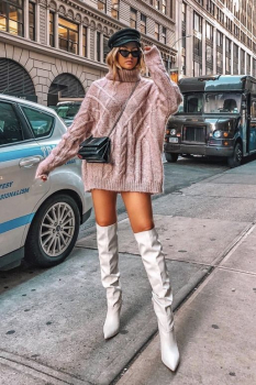 Зимой в 2019 году стилисты предлагают выбирать пастельную цветовую гамму, поэтому обрати внимание на: пыльно-розовый, мятный, лиловый оттенки, стандартный белый, черный или серый цвета. Но как правильно носить платье-свитер?