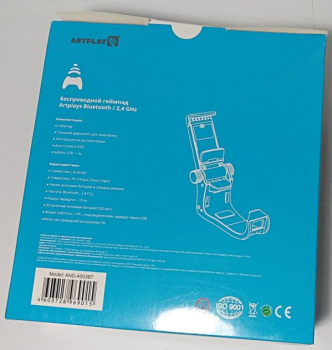Джойстик Artplays AC55 продается в упаковке из относительно тонкого картона, окрашенной в синий и белый цвета. На передней грани коробки есть окошко, забранное прозрачным пластиком, сквозь которое можно увидеть сам геймпад. Таким образом, можно сразу, еще до покупки и распаковки оценить внешность предлагаемого устройства.