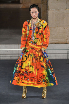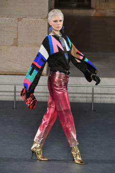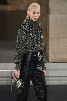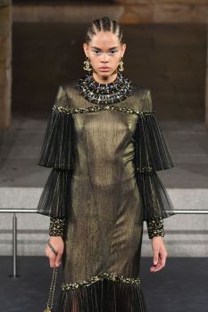 Новая коллекция была насыщенна объемными твидовыми жакетами, приталенными платьями в золоте, твидовыми пальто и юбками, брючными костюмами, комбинезонами, массивными украшениями, ботфортами, шляпами и сумками.