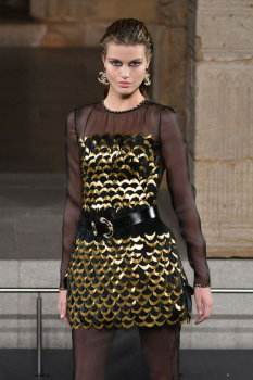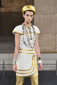 Не только декорации переносили зрителей в Древний Египет, но и одежда, аксессуары и обувь, которые модели представили в новой коллекции Chanel Pre-Fall 2019. Дизайнер решил сделать в коллекции акцент на золото, синий цвет, принты, имитирующие иероглифы, сумки-пирамиды и массивные украшения.