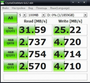 С USB 2.0 все было понятно сразу, еще до подключения – винчестер, рассчитанный под более современный стандарт, будет работать на максимальной для этого интерфейса скорости. Так и вышло: на чтение он выдал 32 Мб/с, а на запись – 25 Мб/с. Как видно, это ниже заявленных 140 Мб/с, но на большее не способен уже сам USB 2.0.
