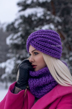 - Вязаная чалма. Если ты боишься испортить красивую укладку и хочешь выглядеть при этом женственно, обрати внимание на чалму. Облегающий фасон шапки модно будет выглядеть с декором в виде брошки, большого камня или банта.