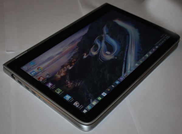 Вместе две панели соединяет пара тугих петель, способных проворачиваться вокруг двух осей, за счет чего удалось обеспечить угол вращения 360 градусов. Стоит отдать должное инженерам, поскольку механизм, с одной стороны, не требует прикладывать чрезмерного усилия для раскрытия, а с другой – надежно удерживает экран в любом положении. Ко всему прочему, за месяц усиленного тестирования в петлях так и не появился люфт, и они продолжают успешно выполнять свое предназначение. Итак, зачем же нам такой большой угол раскрытия? Всё очень просто: устройство может успешно функционировать в четырех различных режимах: классическом (угол раскрытия 90 – 150 градусов), режиме планшета (угол 360 градусов, клавиши при этом будут находиться снизу), режиме «шалаша» (угол 160-170 градусов) и в качестве панели (270-290 градусов). Поддерживается автоповот экрана, полноценный сенсорный ввод, и даже кнопка «Windows» имеется. И хотя гаджет для «таблетки» получился довольно громоздким и тяжелым (в одной руке его долго не удержать), режим планшета можно рассматривать как полезную опцию, в том случае, когда необходимо быстро отправить почту или что-то отредактировать, а балансировать с раскрытым ноутбуком на коленях крайне удобно. Два оставшихся положения отлично подойдут, если использовать устройство в качестве монитора с внешней клавиатурой и мышью (лишнее место между экраном и глазами не занимает клавиатура), либо при просмотре видео, когда клавиатура особо не нужна.