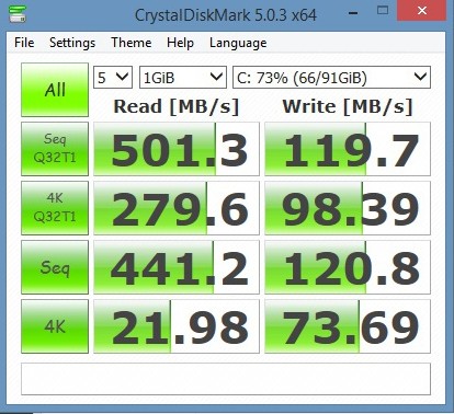 В тесте оперативной памяти AIDA64 получаем весьма хорошие показатели: скорость чтения памяти 19336 МБ/с, а записи – 18846 МБ/с, копирования 16077 МБ/с, задержка – 82,2 нс. Для измерения производительности SSD, мы воспользовались несколькими утилитами ATTO Disk Benchmark и Crystal Disk Mark. Первая определила максимальную скорость последовательной записи на уровне 120 МБ/с, а чтения на уровне 520 МБ/с, вторая дает примерно такие же результаты: 501 МБ/с и 120 МБ/с соответственно.