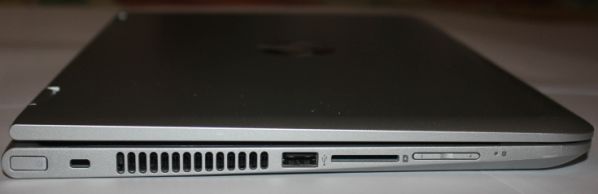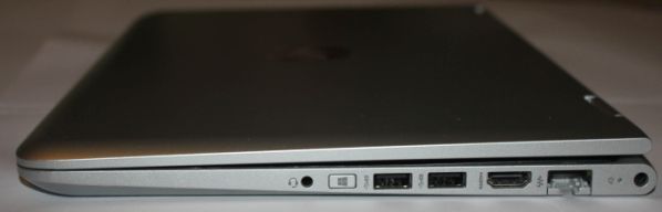 Гаджет имеет целых три порта USB (редко встречающаяся роскошь для устройств такого типа): USB 2.0 слева и два USB 3.0 на правом торце. На левом ребре также можно обнаружить кнопку включения, кардридер, качельку громкости, индикатор работы диска и решетку радиатора. Справа — комбинированный аудиоразъем (наушники, микрофон), не выделяющаяся клавиша «Windows», HDMI-порт, сетевой разъем RJ-45, гнездо для адаптера питания и индикатор зарядки. Здесь же можно заметить и специальное гнездо для замка Kensington. Снизу можно обнаружить стереодинамики, решетку для забора воздуха, а также несколько резиновых ножек.