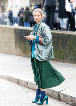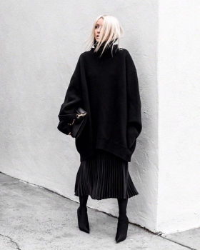 Чтобы избежать визуальной полноты, комбинируй ее с объемными свитерами и удлиненными жакетами. Если не хочешь выглядеть старше, сочетай плиссированную юбку с грубыми ботинками, кроссовками или высокими сапогами.
