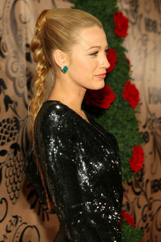 - Высокий хвост Блейк Лайвли. Определенно, конский хвост, поделенный резинками на сегменты, выглядит на актрисе очень эффектно и неординарно.