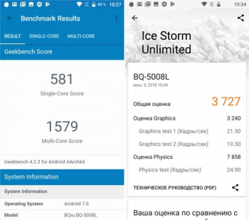 Проблем с Geekbench и 3DMark с пакетом Ice Storm Unlimited не возникло: в этих приложениях смартфон заработал 581/1579 и 3727 баллов соответственно. Во время проверки корпус ощутимо грелся в месте нахождения системной платы с процессором и памятью.