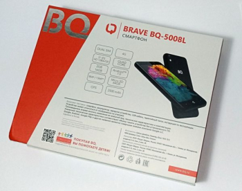Снизу коробки тоже есть изображение смартфона, но уже в черном цвете, и рядом с ним находятся список характеристик и перечень аксессуаров, входящих в комплект поставки. Упаковка BQ Brave выглядит красиво и очень нарядно, особенно в сравнении с современными флагманами от ААА-брендов, коробки которых не несут на себе ни грамма полезной информации.