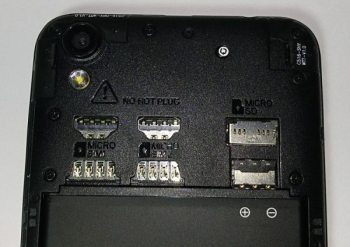 Под съемной задней крышкой находятся место под аккумулятор, отдельный слот microSD и два слота под SIM-карты. Горячая замена карточек невозможна в принципе – это можно сделать только после извлечения батареи.