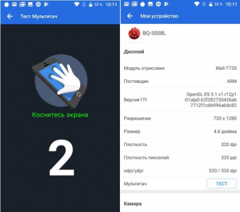 Дисплей в BQ Brave базируется на современной матрице IPS с диагональю 5 дюймов и разрешением HD. Это стандартные параметры для большинства современных смартфонов за $100, хотя кое-где до сих пор встречается устаревшая матрица TN. В данном случае экран демонстрирует весьма неплохие углы обзора и минимальную, на уровне погрешности, инверсию цветов, но только без комплектной защитной пленки – с ней инверсия уже ощутимо сильнее, что, впрочем, совершенно не влияет на эксплуатационные свойства смартфона.