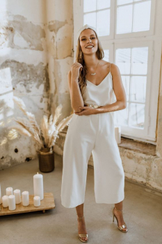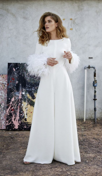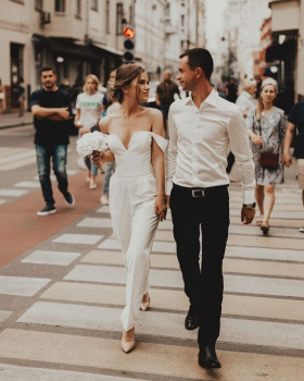 Свадебное платье — это, конечно, красиво, привычно и традиционно, но если ваша роспись припадает на холодное время года, то в платье в пол особо не походишь. К тому же, в последнее время огромной популярностью пользуются скромные свадьбы, после которых молодожены уезжают на карете в теплый закат солнца на Бали, в Таиланд или Египта. Поэтому заморачиваться по поводу платья совсем не хочется.