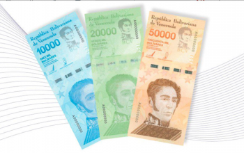 Хождение трех новых банкнот номиналом в 10, 20 и 50 тысяч боливаров начинается на территории Венесуэлы.