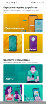 Совсем без модификаций здесь все же не обошлось: производитель установил набор собственных тем оформления My UX, заметно меняющих интерфейс системы и поддерживающий создание пользовательских модификаций. Доступен и фирменный набор «умных» функций Moto Experiense, из которых стоит отметить активацию фонарика тряской, вызов приложения камеры поворотом запястья, приглушение звонка поднятием телефона и полное глушение переворотом, адаптация производительности под пользователя с помощью ИИ, а также встроенный эквалайзер и переключение треков клавишами громкости. Есть тут и свой игровой режим Gametime, который оптимизирует работу игр и блокирует внешние раздражители. Интерфейс отзывчивый и работает плавно, поддерживается управление жестами, с регулировкой чувствительности.
