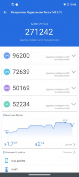 Платформа Moto G9 Plus строится на производительном процессоре среднего уровня Snapdragon 730G (2 ядра Kryo 470 Gold 2.2 ГГц и 6 ядер Kryo 470 Silver 1.8 ГГц) с графическим чипом Adreno 618. Используется 4 ГБ двухканальной оперативной памяти типа LPDDR4/4X и 128 ГБ постоянной памяти (UFS 2.1) с возможностью расширения за счет microSD объемом до 512 ГБ. Этого вполне хватит для стабильной работы большинства современных игр на высоких настройках графики, тест AnTuTu выдает более 270 000 баллов. Во время работы смартфон практически не нагревается, а троттлинг выражен слабо.