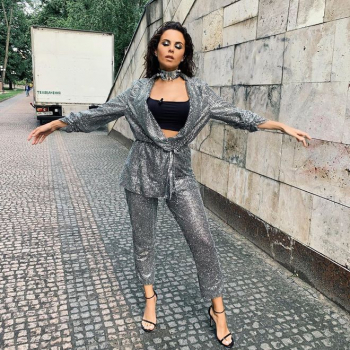 А для финального испытания участников шоу Каменских сделала выбор в пользу стильного серебристого брючного костюма — укороченные брюки и свободный жакет, который звезда надела поверх черного кроп-топа. Дополнили образ изящные черные босоножки на шпильке и оригинальное массивное колье. Главным акцентом всего образа стал эффектный макияж смоки-айс и «мокрая» укладка.
