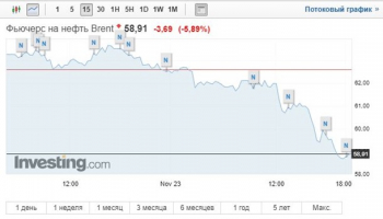 К вечеру пятницы, 23 ноября, падение цен на нефть усилилось, Brent опустилась ниже $59 за баррель, а утром котировки стартовали ниже 62 долларов, пишет агентство Bloomberg.