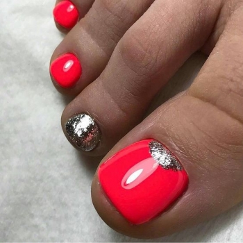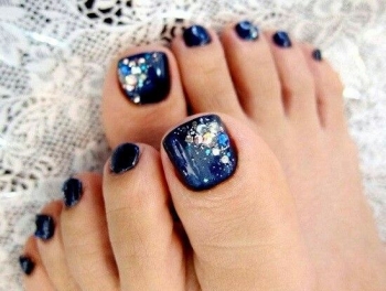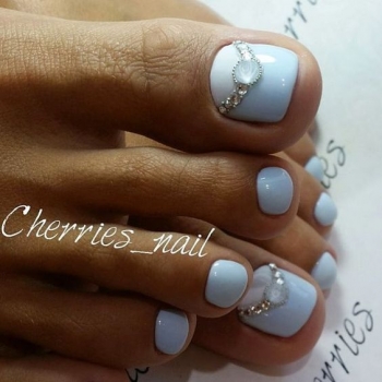 Если ты хочешь создать педикюр в новогоднем духе, тогда попробуй воплотить яркий дизайн новогодней символикой: со снежинками, с Санта Клаусом. Традиционные цвета Нового года — это комбинация сине-голубого и белого цветов. Поэтому можешь просто смело комбинировать однотонный дизайн на ноготках.