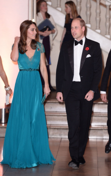 Для такої події Кейт Міддлтон вибрала досить оригінальну сукню з глибоким декольте від бренду Jenny Packham насиченого бірюзового відтінку. Вбрання Кейт Міддлтон привернуло увагу не тільки глибоким декольте, а й тим, що герцогиня вже виходила у світ у подібному вбранні: у 2012 році Кейт з’явилася в ньому на урочистому вечорі на честь Олімпійських ігор.